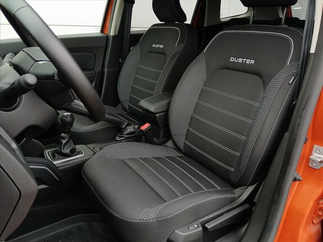 Tapicerka materiałowa w kolorze czarnym z białymi przeszyciami i logiem Duster